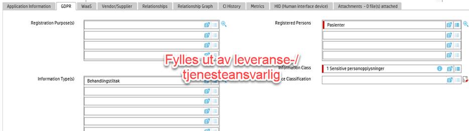 Service Level Manager (SLM) er ansvarlig for at applikasjoner knyttes mot tjeneste og tjenesteutvikler er ansvarlig for at informasjon ang. GDPR blir kartlagt, registrert og oppdatert for applikasjoner som tidligere er overlevert og som mangler informasjonen.