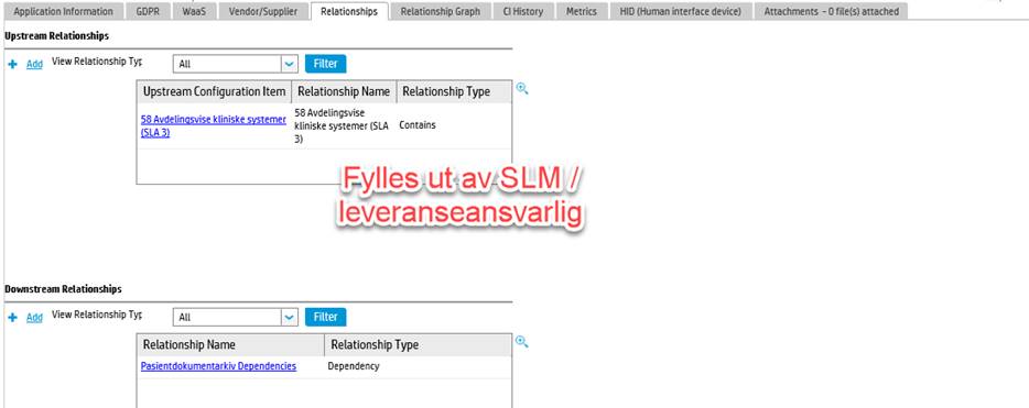 - Dersom applikasjonen bruker en integrasjonsapplikasjon, f.eks. BizTalk. skal det legges inn relasjon til denne. Relasjonstypen avhenger av hvor kritisk avhengigheten er.