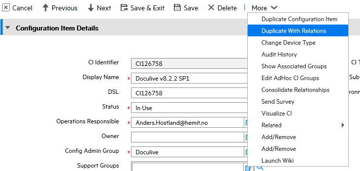 NB! Ved produksjonssetting av en patch eller mindre feilretting / oppgradering uten ny funksjonalitet er det generelt nok å oppjustere versjonsnummeret på eksisterende CI i Service Manager, og legge inn en kommentar om hva, hvorfor og når dette har skjedd.