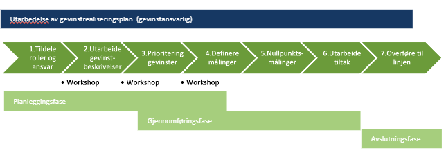 Prosjektet har ansvar for å identifisere og planlegge gevinster og målinger i tett samarbeid med linjeorganisasjonen, slik at linjen har et godt utgangspunkt for videre oppfølging etter prosjekt.